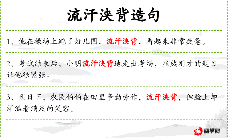 2. 【流汗浃背】 - ①形容出汗多,湿透了背上的衣服。②形容惭愧不安之极。