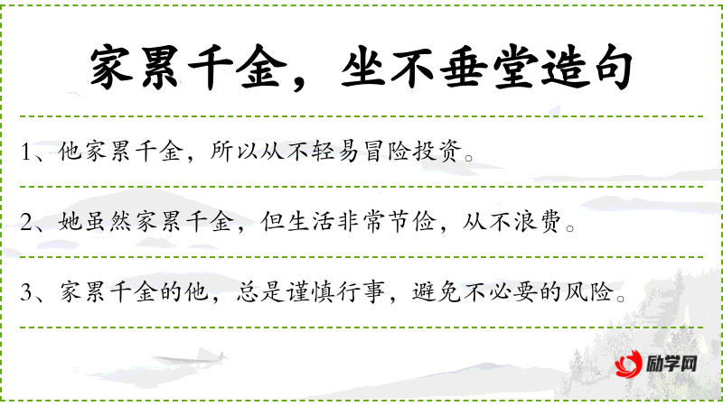 - 家累千金:形容家庭非常富有,拥有大量财富。
