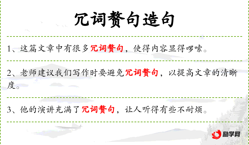3. 【冗词赘句】 冗:繁杂;赘:多余无用的。指诗文中多余无用的话。