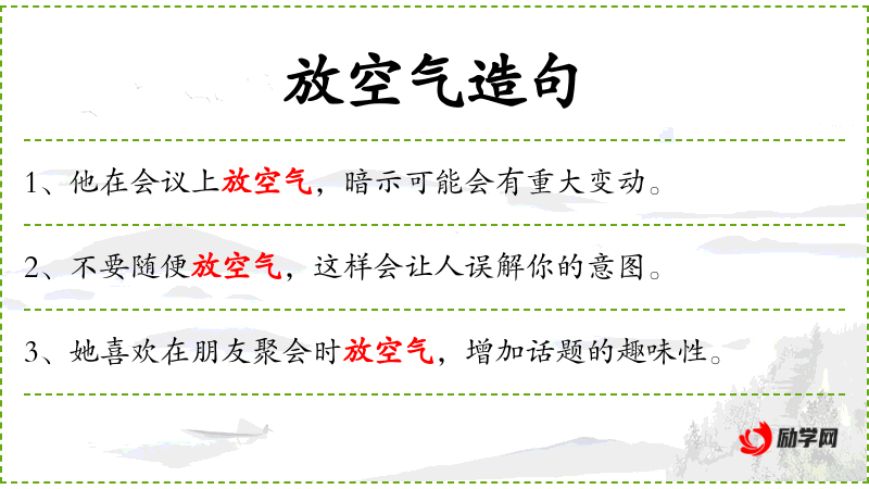 “放空气”这个短语在中文里可能是一个比喻,表示引入轻松、幽默的元素。这可能与**的社交文化有关,人们通常希望在聚会中保持轻松愉快的氛围。