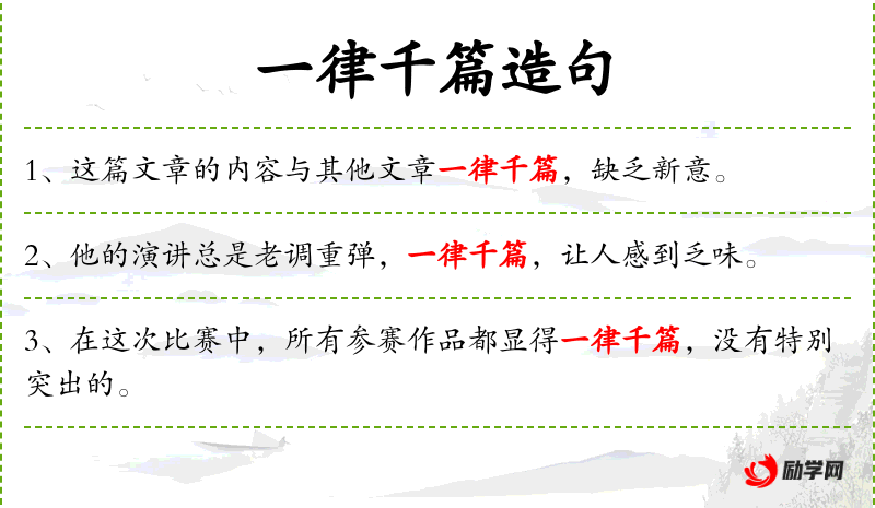 1. 【一律千篇】 一律:同样的。一千篇文章都一个样。指文章、题材、写法公式化。泛指事物形式陈旧呆板。