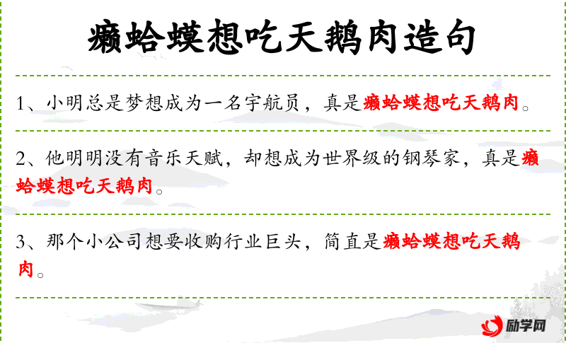 4. 【癞蛤蟆想吃天鹅肉】 比喻人没有自知之明,一心想谋取不可能到手的东西。