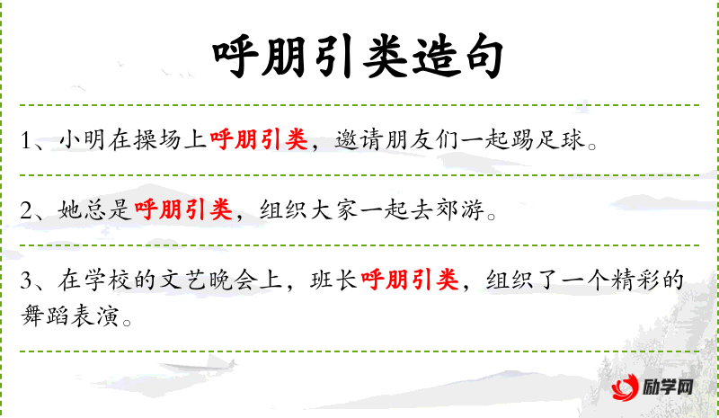 - 呼朋引类:call on friends and gather like-minded people,意为召集朋友和志同道合的人。