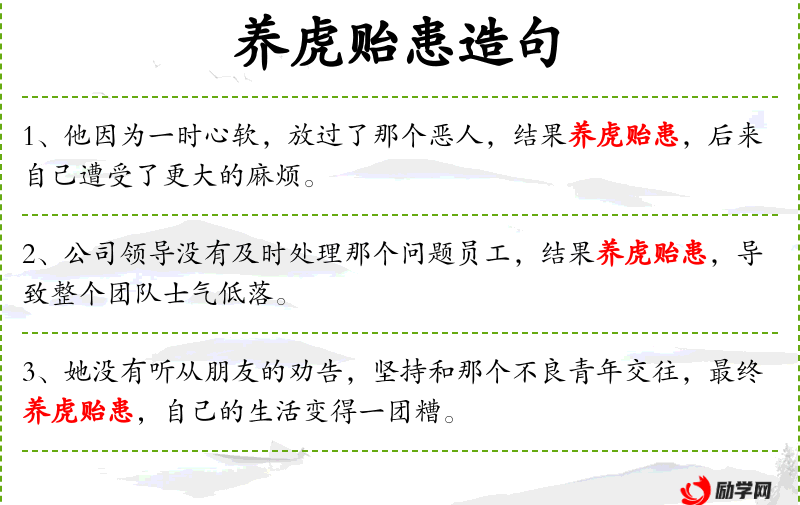 - 成语:“养虎贻患”是一个**成语,用来形容自找麻烦或自招祸患。