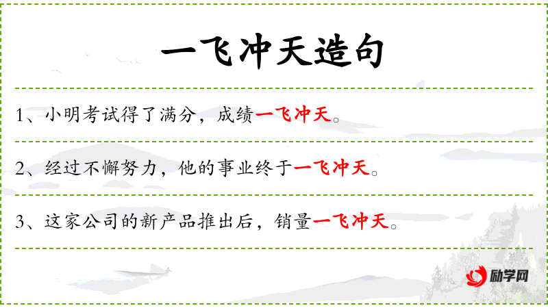 1. 【一飞冲天】 - 鸟儿展翅一飞,直冲云霄。比喻平时没有特殊表现,一下做出了惊人的成绩。