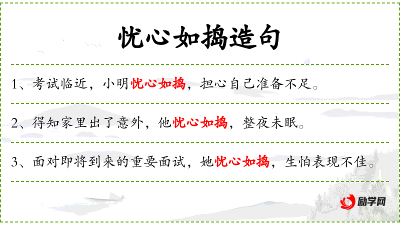 - 忧心如捣:形容非常忧虑,担心到极点。
