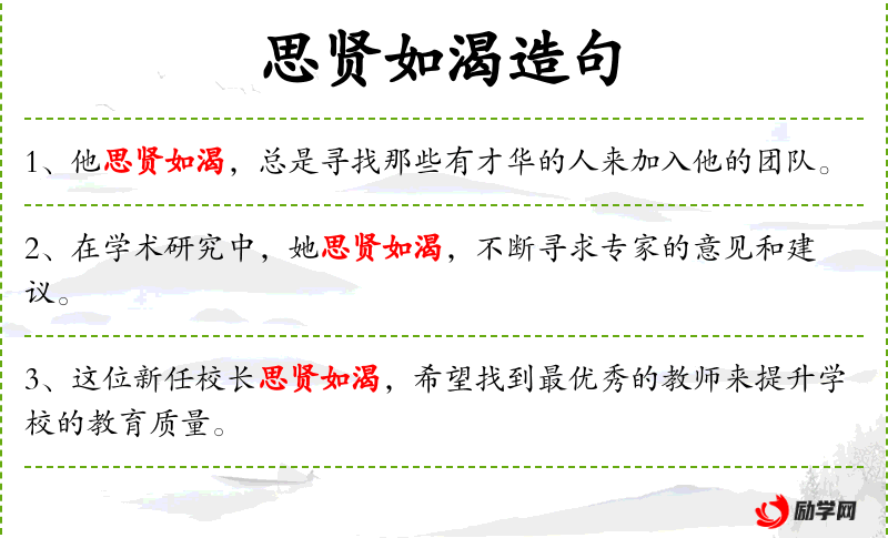 句子:“在学术研究中,她思贤如渴,不断寻求专家的意见和建议。”