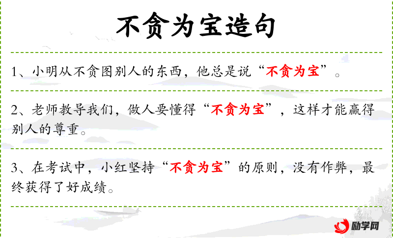 - 不贪为宝:这是一个成语,意思是“不贪心就是宝贵的品质”。