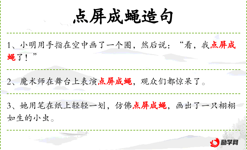 2. 【点屏成蝇】 - 屏:屏风。把屏风上的污点画成苍蝇。形容绘画技术十分高超。