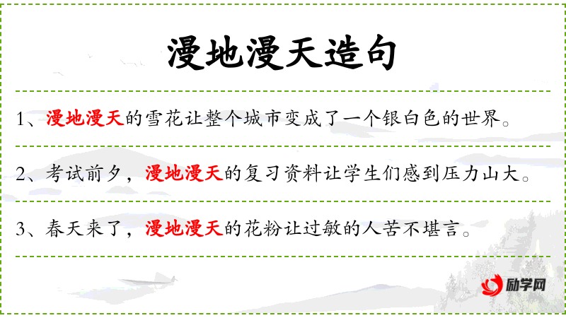 3. 【漫地漫天】 - 漫:满。充满天地之间。形容数量极多,到处皆是。亦作“漫天漫地”。