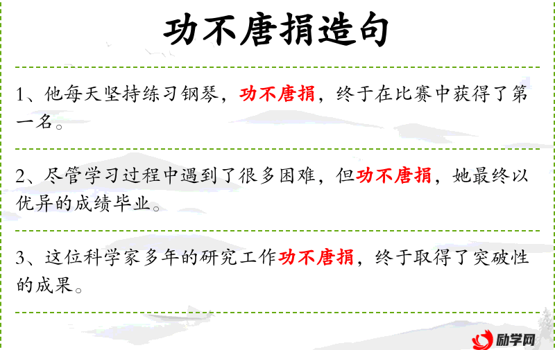 “功不唐捐”是一个成语,源自《左传·僖公二十五年》,强调努力和付出终将得到回报。这个成语在文化中常用来鼓励人们坚持不懈。