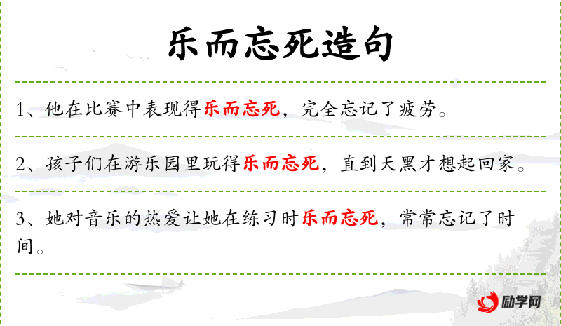 - 成语:乐而忘死,源自《左传·宣公十五年》,形容非常快乐以至于忘记了其他一切。