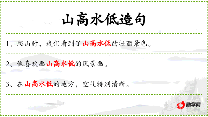 - 山高水低:形容词短语,形容山势高耸,水流低落,常用来形容自然景观的壮丽。