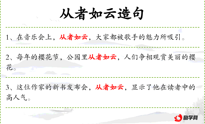 - 从者如云:形容跟随的人非常多,像云一样密集。