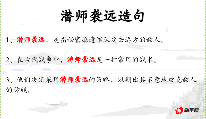 1. 【潜师袭远】 潜师:秘密调动兵力。秘密发兵,袭击远距离的敌人。