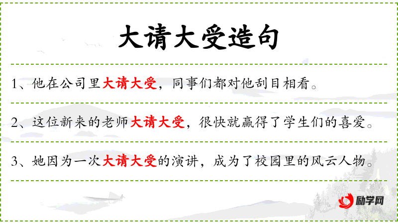 - 大请大受:这个词组可能是一个成语,意指非常受欢迎或受到高度评价。
