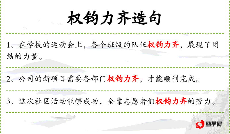 2. 【权钧力齐】 - 钧:通“均”,平均,平等;力齐:协力。齐心协力用权,不专权。