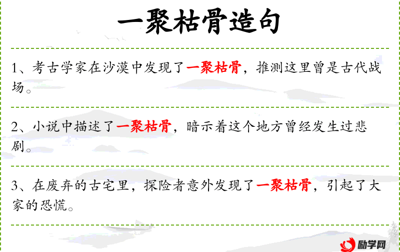 2. 【一聚枯骨】 一聚:一堆。一堆枯朽的骨头。指人死已久。