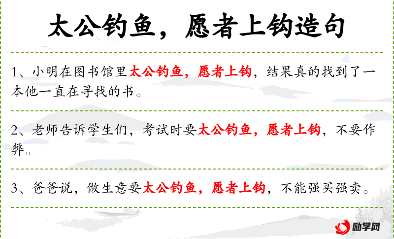 - 英文:The teacher told the students that during the exam, they should be like Tai Gong fishing, where only those who are willing will bite the hook, and should not cheat.