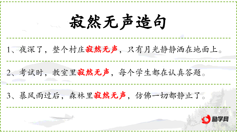 - 寂然无声:形容非常安静,没有声音。