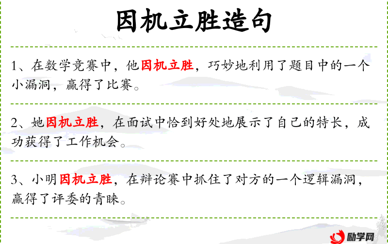 句子:“他因机立胜,在考试中巧妙地运用了平时积累的知识点,取得了优异的成绩。”