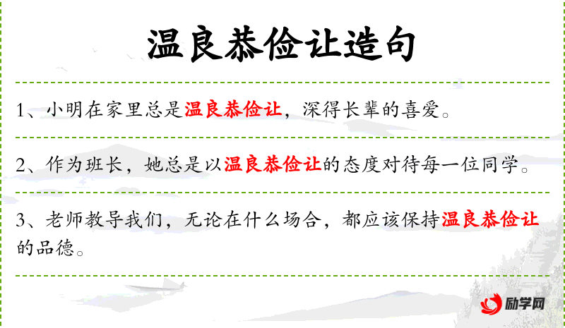 3. 【温良恭俭让】 - 原意为温和、善良、恭敬、节俭、忍让这五种美德。这原是儒家提倡待人接物的准则。现也形容态度温和而缺乏斗争性。