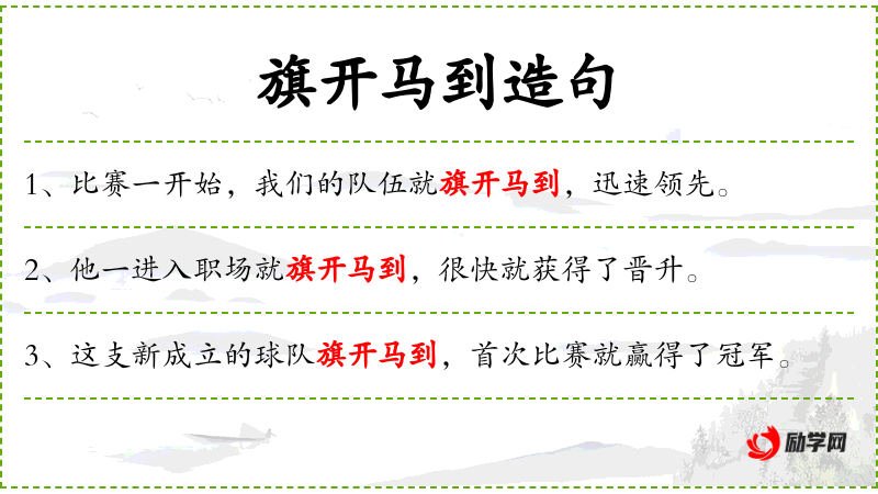 - 旗开马到:成语,比喻事情一开始就非常顺利。