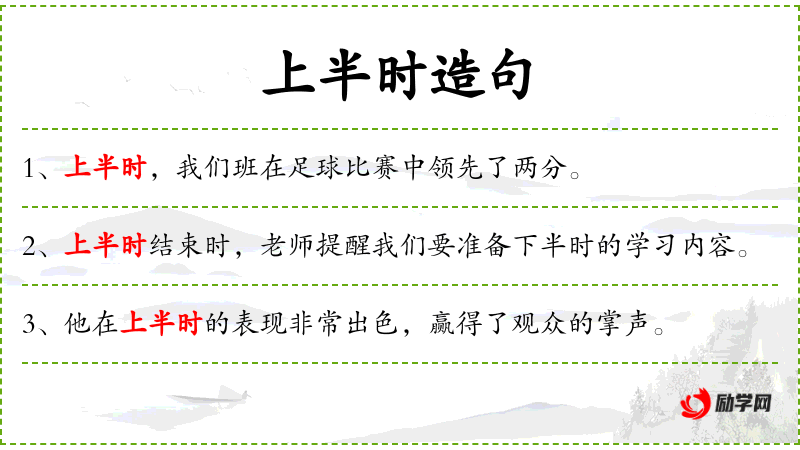 1. 【上半时】 - 足球、水球等球类比赛,全场比赛分作两段时间进行,前一段时间叫上半时。也说上半场。