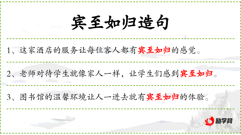 - 宾至如归:成语,形容客人受到热情接待,感觉像回到自己家一样