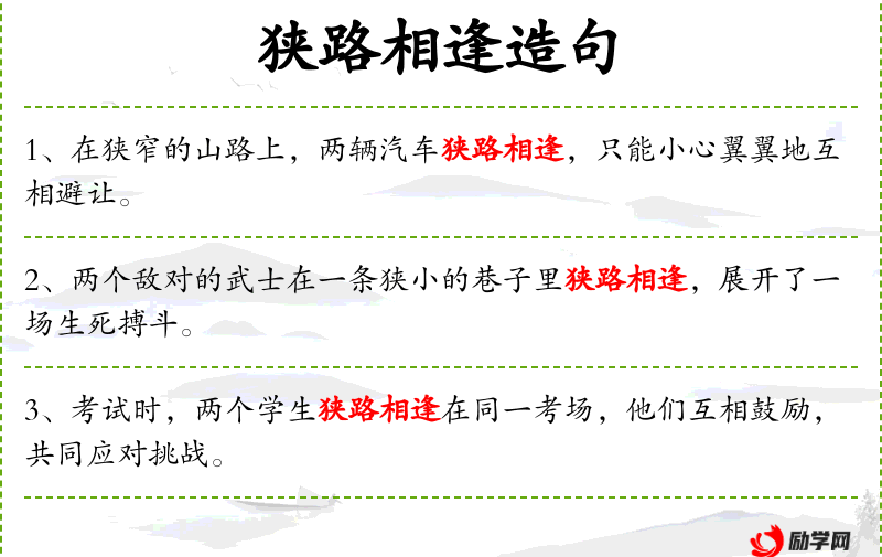 2. 【狭路相逢】 - 在很窄的路上相遇,没有地方可让。后多用来指仇人相见,彼此都不肯轻易放过。