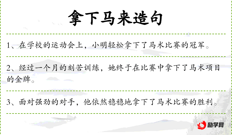 - 状语:经过一个月的刻苦训练、在比赛中、马术项目