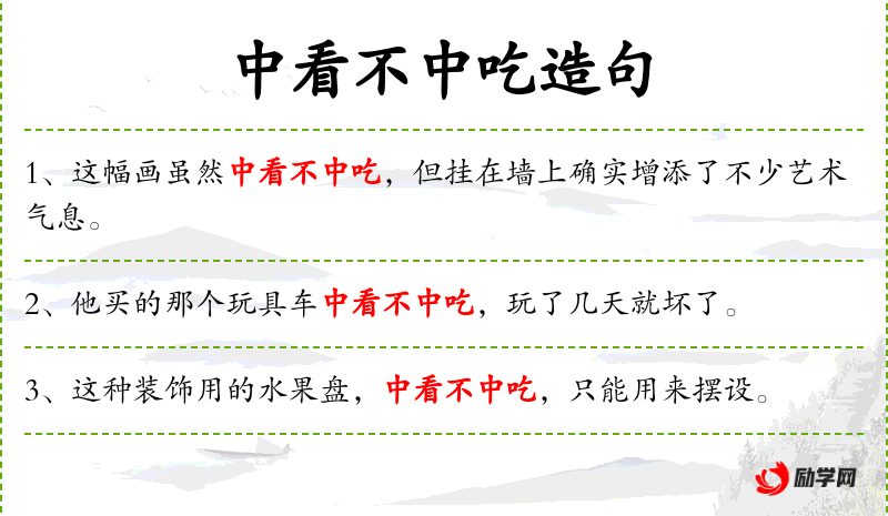 句子中“中看不中吃”是一个成语,原意是指外观好看但不好吃,这里用作比喻,表示外表美观但无实用价值。这个成语反映了**文化中对事物实用性和美观性的双重考量。