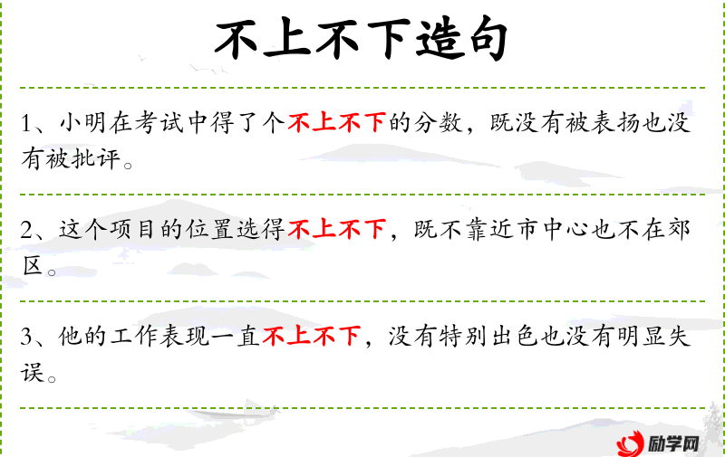 - 不上不下:形容处于中间状态,既不好也不坏。
