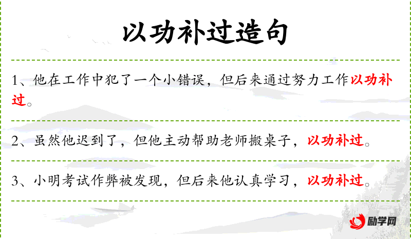 句子中“以功补过”是一个成语,源自**传统文化,意指用好的行为或成就来弥补之前的过失。这体现了中华文化中对自我修正和积极面对错误的价值观。