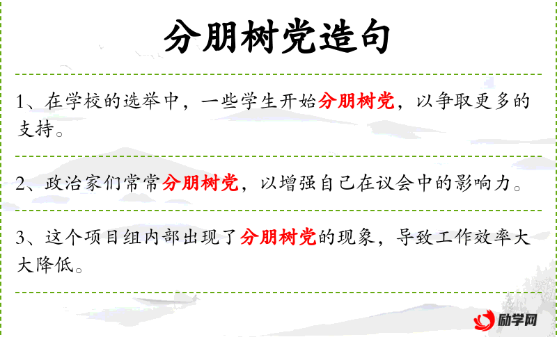 - 分朋树党:指在团队或组织内部形成小团体,互相排斥或对立。