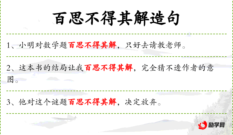 1. 【百思不得其解】 - 百:多次;解:理解。百般思索也无法理解。