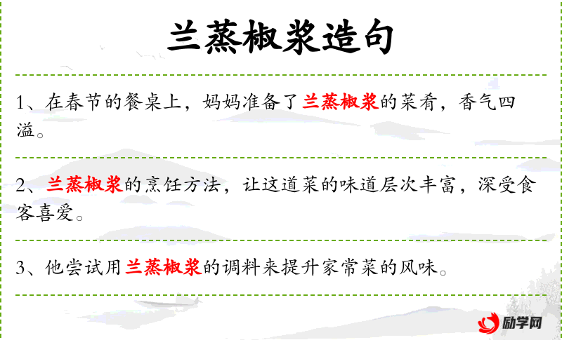 - “兰蒸椒浆的香味在厨房中四溢,勾起了人们的食欲。”