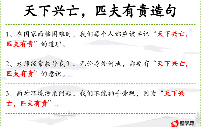 - 天下兴亡,匹夫有责:成语,意为国家的兴衰,每个人都有责任。