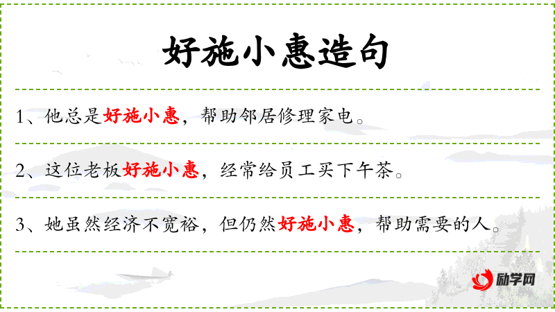 - 好施小惠:乐于给予小恩小惠,形容人慷慨、乐于助人。