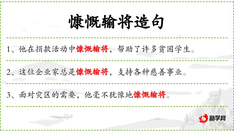 1. 【慷慨输将】 毫不吝啬地捐献财物帮助人。多用在对社会对群众。