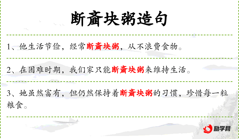 4. 断齑块粥:名词短语,形容节俭的生活方式。