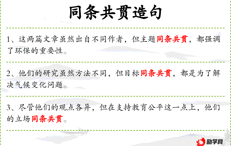 - 谓语:“不同”和“同条共贯”