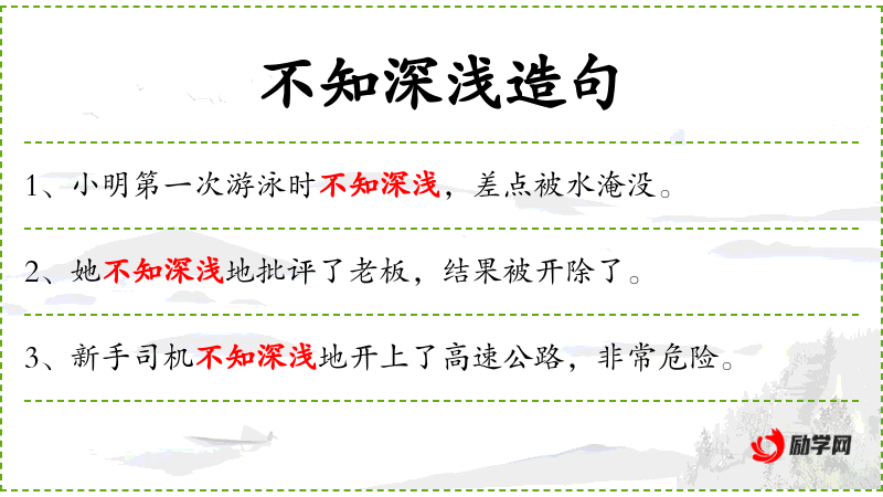1. 【不知深浅】 - 原意是不知道水的深浅。后多用以形容不懂得事情的利害。