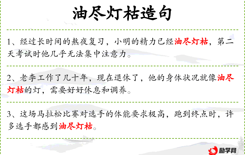 4. 【油尽灯枯】 - 灯油熬干了,火也灭了。比喻生命衰竭直至老死。
