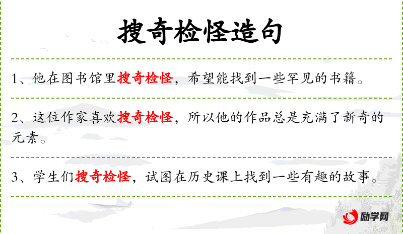 - 搜奇检怪:寻找不寻常或罕见的事物。