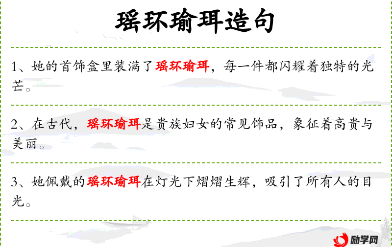 3. 【瑶环瑜珥】 - 瑶:美玉;环:玉圈;瑜:美玉;珥:玉制的耳饰。比喻美好如玉的子弟。