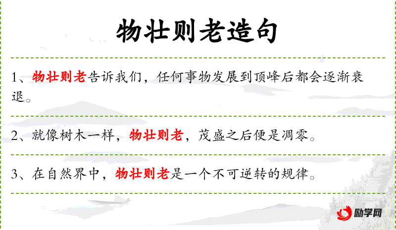 3. 【物壮则老】 壮:壮实,强壮;老:老死。事物壮盛到了极点就会衰朽。指一切事物盛极必衰的自然规律。