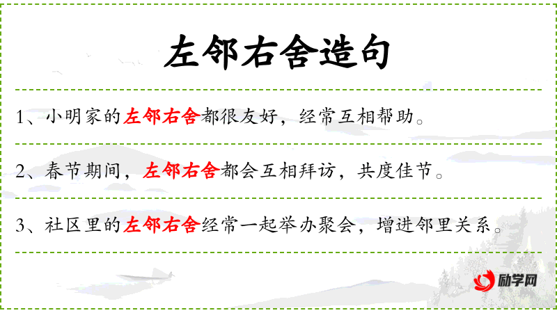句子:“小明家的左邻右舍都很友好,经常互相帮助。”