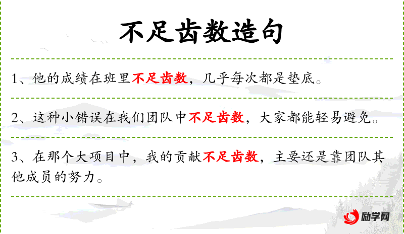 - 不足齿数:这个成语反映了**文化中对谦逊和自我贬低的价值观。