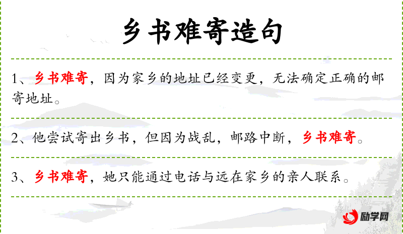 1. 【乡书难寄】 乡书:家书。家书很难寄回家中。比喻与家乡消息隔绝。